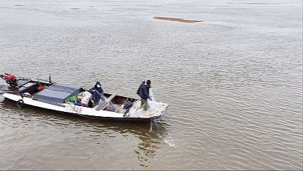 在松花江江面,薄雾笼罩,渔船缓缓驶入松花江滩地水域。渔民们熟练地整理渔网,找准鱼群活动区域后,果断下网。稍作等待后,收网的时刻到了。渔民们双手紧握网绳,用力拉拽。随着渔网逐渐收拢,缓缓出水,里面装满了活蹦乱跳的江鱼。经过数小时连续作业,渔船满载而归。